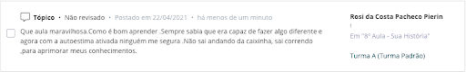 Após todas as aulas, os alunos encontram um exercício de reflexão para ser feito na Comunidade do Facebook e acompanhado pela Rachel que lê todos os comentários e deixa suas observações, quando necessário, com o objetivo de ajudar os alunos na melhor compreensão do assunto da aula dada.